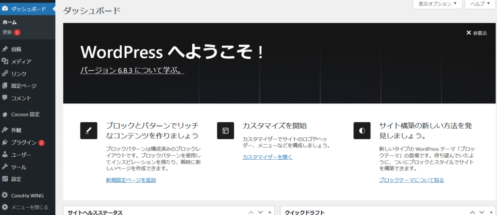 WordPress左メニューに「Cocoon設定」が追加されていれば成功です 🎉