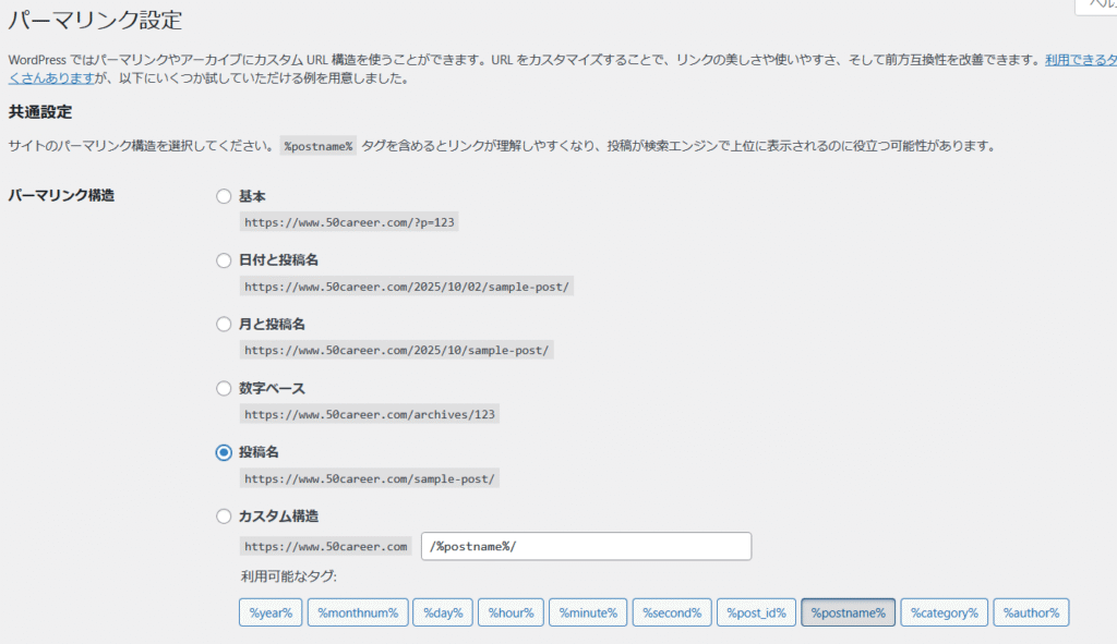 • パーマリンク設定:「投稿名」に変更(SEO対策)